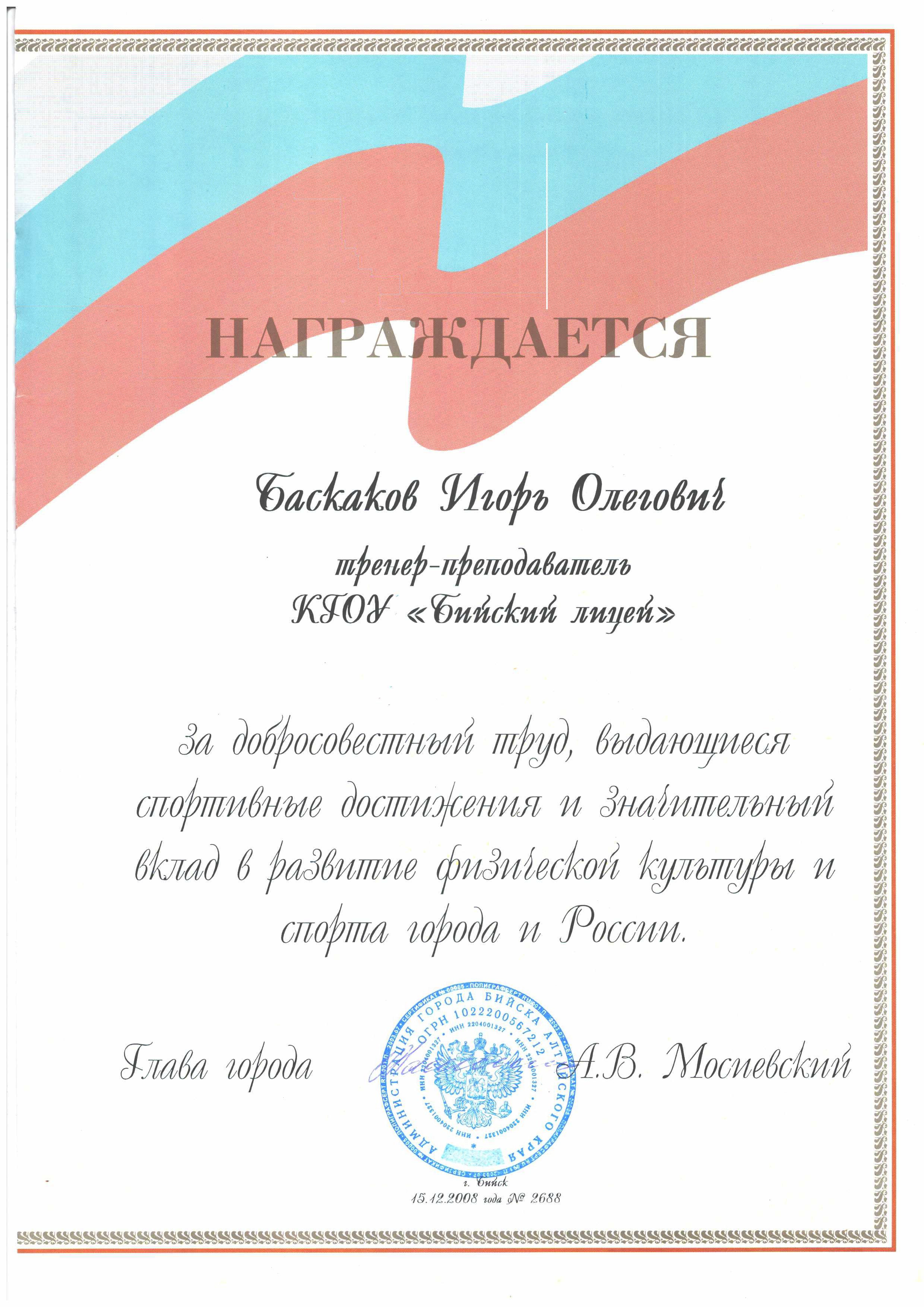 25. Грамота. Награждается Баскаков Игорь Олегович – тренер-преподаватель КГОУ «Бийский лицей» за добросовестный труд, выдающиеся спортивные достижения и значительный вклад в развитие физической культуры и спорта города и России (г. Бийск, 2008 год)