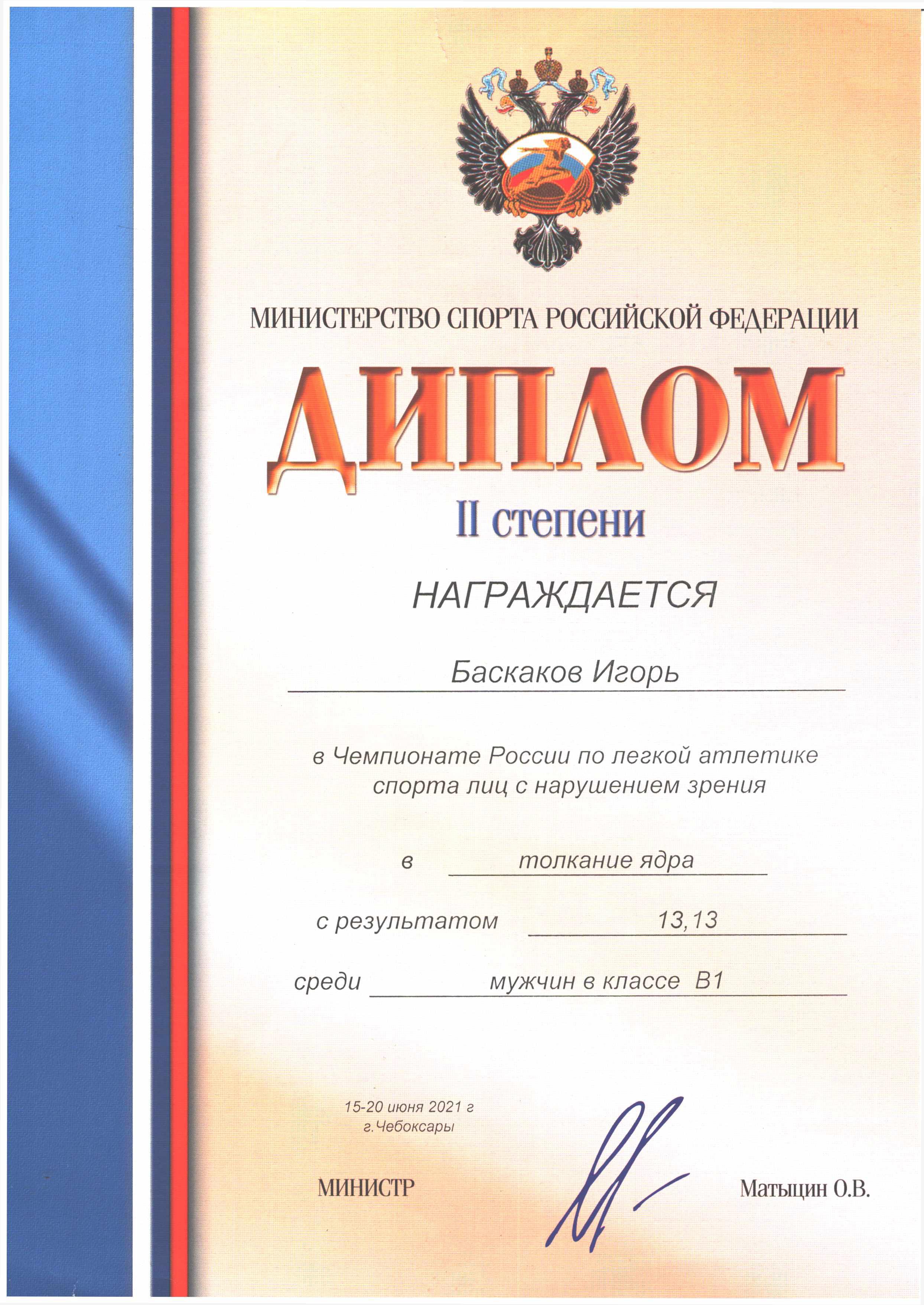 30. Диплом II степени. Награждается Баскаков Игорь за участие в Чемпионате России по лёгкой атлетике спорта лиц с нарушением зрения в толкание ядра с результатом 13,13 м среди мужчин в классе В1 (г. Чебоксары, 2021 год)