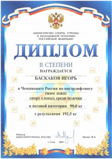 22. Диплом II степени Баскакова Игоря за участие в Чемпионате России по пауэрлифтингу спорт слепых среди мужчин в весовой категории 90 кг. с результатом 192,5 кг (г. Сочи, 2009 год)