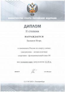 26. Диплом II степени. Награждается Баскаков Игорь в Чемпионате России по спорту слепых (дисциплина – лёгкая атлетика) спортивно-функциональный класс В1 вид толкание ядра с результатом 12,30 м (г. Екатеринбург, 2023 год)