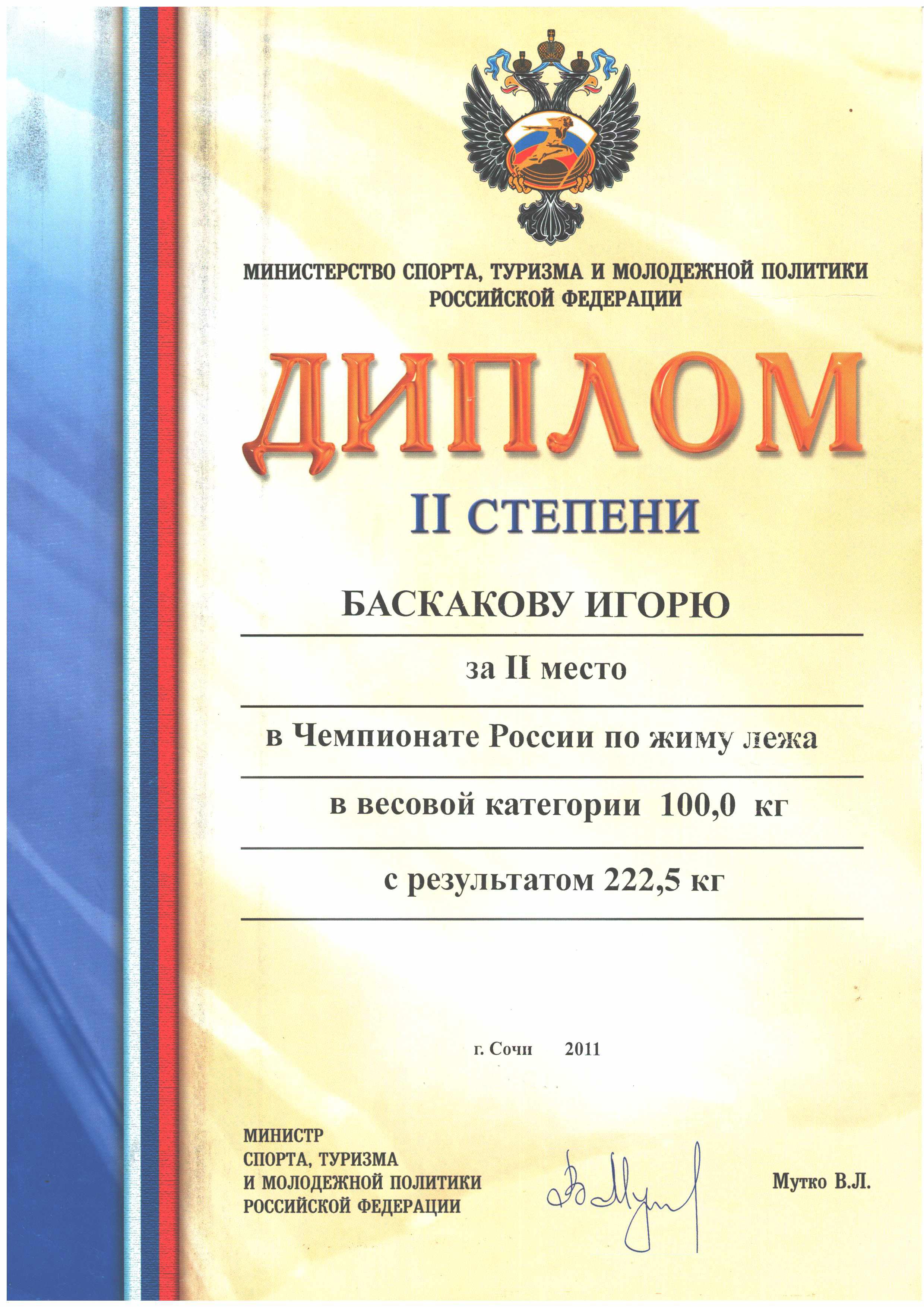 24. Диплом II степени Баскакову Игорю за 2 место в Чемпионате России по жиму лёжа в весовой категории 100 кг с результатом 222,5 кг (г. Сочи, 2011 год)