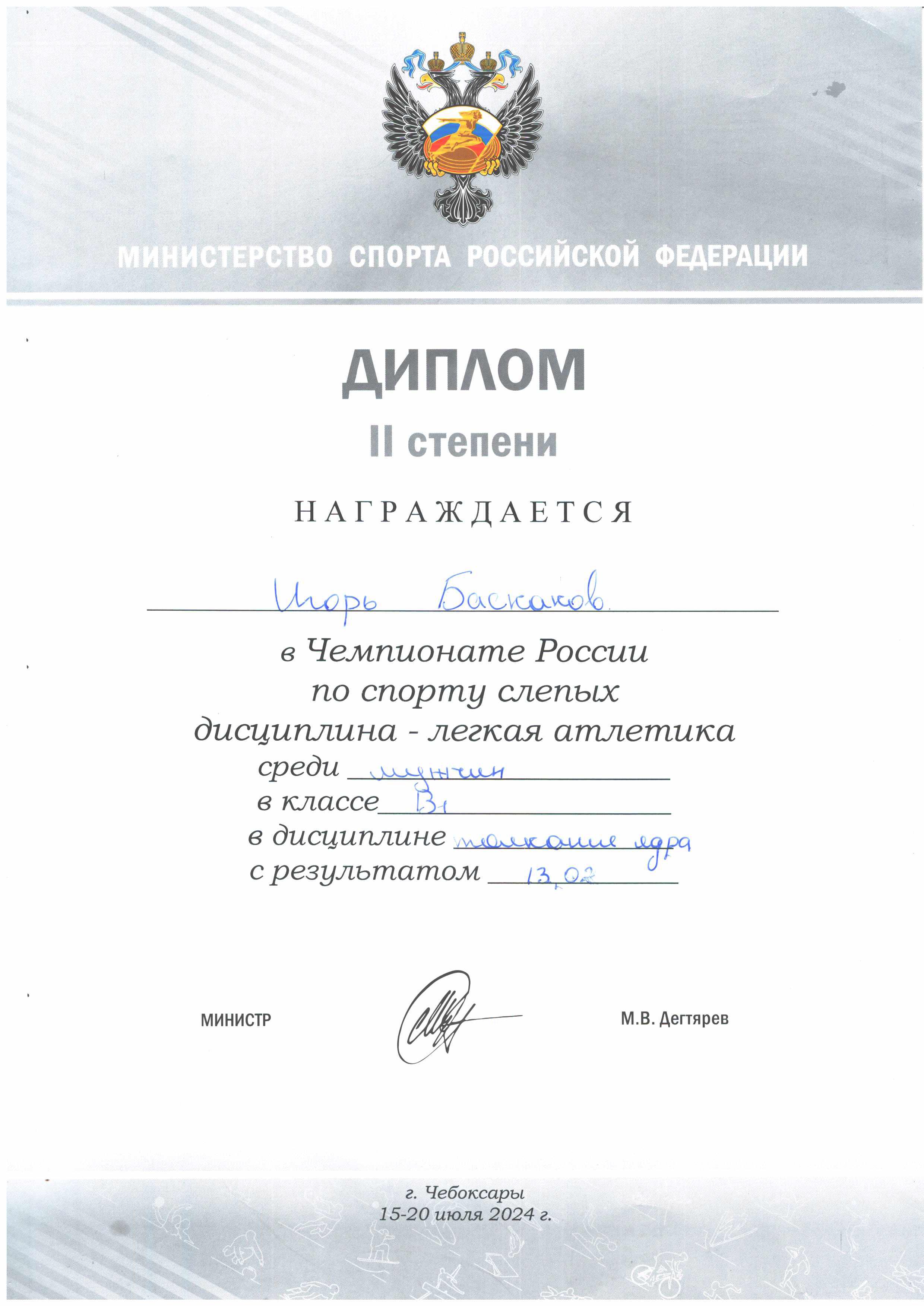 27. Диплом II степени. Награждается Игорь Баскаков за участие в Чемпионате России по спорту слепых (дисциплина – лёгкая атлетика) среди мужчин, в классе В1, в дисциплине толкание ядра с результатом 13,02 м (г. Чебоксары, 2024 год)