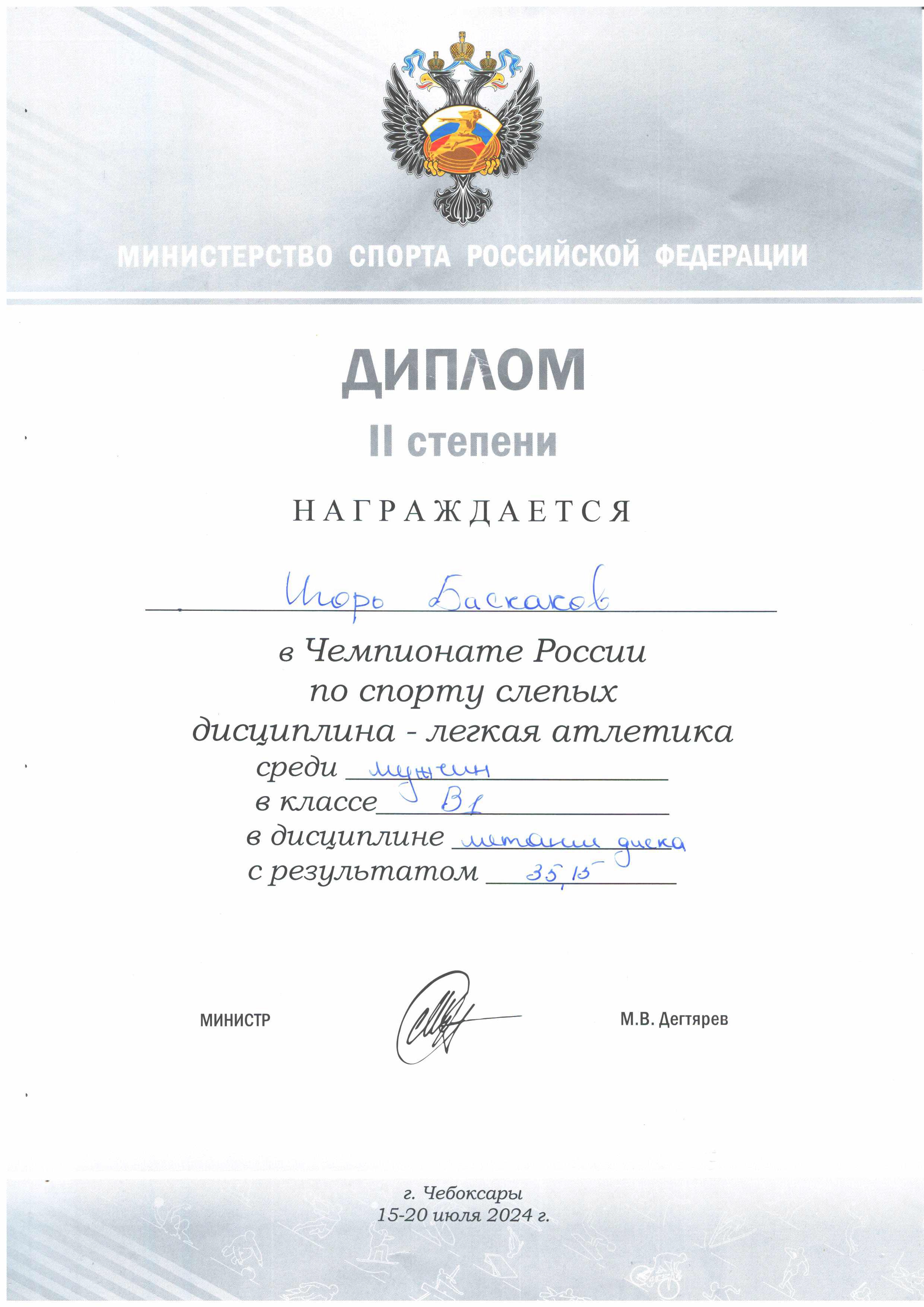 28. Диплом II степени. Награждается Игорь Баскаков в Чемпионате России по спорту слепых (дисциплина – лёгкая атлетика) среди мужчин, в классе В1, в дисциплине метание диска с результатом 35,15 м (г. Чебоксары, 2024 год)