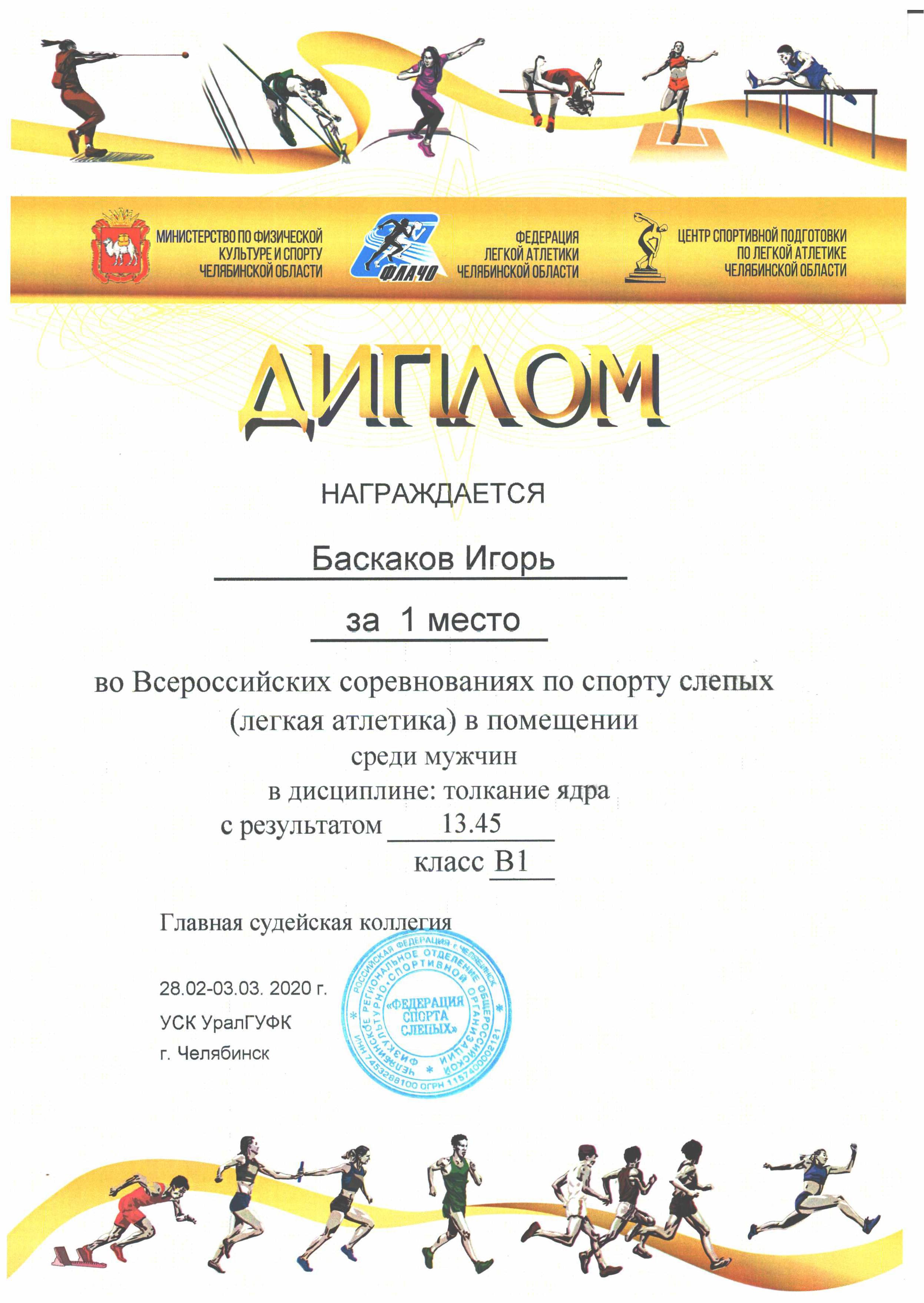 29. Диплом. Награждается Баскаков Игорь за 1 место во Всероссийских соревнованиях по спорту слепых (лёгкая атлетика) в помещении среди мужчин в дисциплине: толкание ядра с результатом 13,45 класс В1 (г. Челябинск, 2020 год)