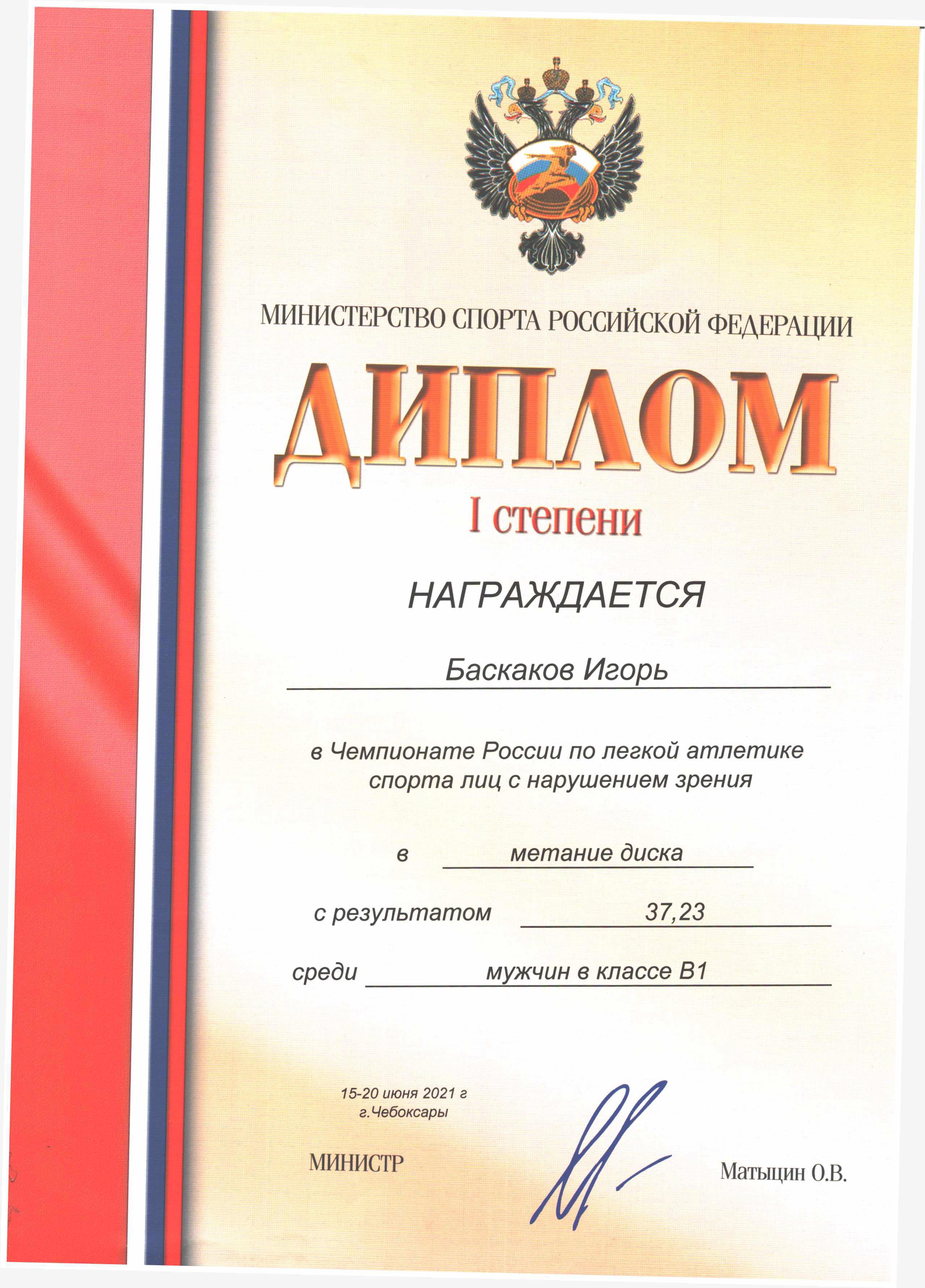 31. Диплом I степени. Награждается Баскаков Игорь за участие в Чемпионате России по лёгкой атлетике спорта лиц с нарушением зрения в метание диска с результатом 37,23 м среди мужчин в классе В1 (г. Чебоксары, 2021 год)