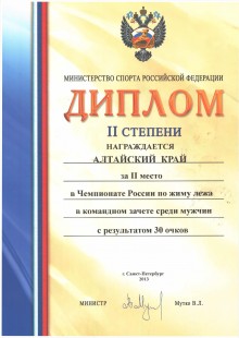 23. Диплом II степени. Награждается Алтайский край за 2 место в Чемпионате России по жиму лёжа в командном зачёте среди мужчин с результатом 30 очков (г. Санкт-Петербург, 2013 год)