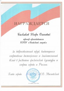 25. Грамота. Награждается Баскаков Игорь Олегович – тренер-преподаватель КГОУ «Бийский лицей» за добросовестный труд, выдающиеся спортивные достижения и значительный вклад в развитие физической культуры и спорта города и России (г. Бийск, 2008 год)