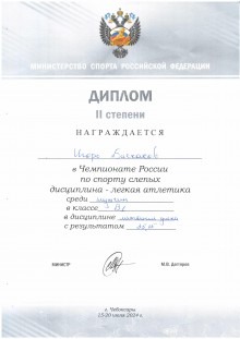30. Диплом II степени. Награждается Баскаков Игорь за участие в Чемпионате России по лёгкой атлетике спорта лиц с нарушением зрения в толкание ядра с результатом 13,13 м среди мужчин в классе В1 (г. Чебоксары, 2021 год)